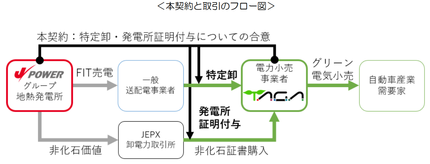 トヨタ自動車東日本株式会社(本社:宮城県黒川郡大衡村中央平1番地 取締役社長:石川 洋之、以下「TMEJ 」)が参画する一般社団法人 東北自動車産業グリーンエネルギー普及協会(所在地:岩手県胆沢郡金ケ崎町西根森山1番地 代表理事:梅原 武、以下「TAGA」)は、7月29日に電源開発株式会社(本社:東京都中央区銀座六丁目15番1号 社長:菅野 等、以下「J-POWER」)と東北地方に所在するJ-POWERグループ地熱発電所電力の特定卸供給に関する契約を締結し、10月より宮城県内への供給を開始することを下記のとおりお知らせします。