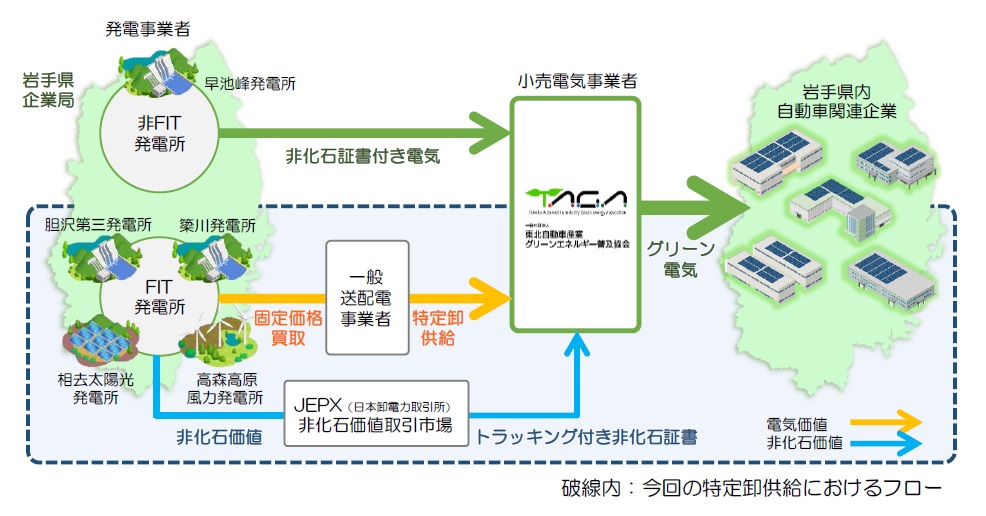トヨタ自動車東日本株式会社(本社:宮城県黒川郡大衡村中央平1番地 取締役社長:石川 洋之、以下「TMEJ」)が参画する一般社団法人東北自動車産業グリーンエネルギー普及協会(所在地:岩手県胆沢郡金ケ崎町西根森山1番地 代表理事:梅原 武、以下「TAGA」)は、岩手県が経営する公営企業の岩手県企業局(以下「企業局」)と再生可能エネルギー電気特定卸供給に係る協定を締結し、岩手県内へ供給する計画であることを下記のとおりお知らせします。